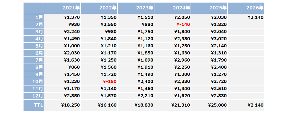 当イブニングトレードシステムは、バックテスト5年(以降はフォワード)の十分なデータ数を消化しており、損益カーブは現在も堅調な右肩上がりを維持しています。欧州、米国市場を通過するイブニングトレードは、日中とは異なった相場傾向を伴うより複雑な動きに順応します。また全システム共通のフィードバック・ロジックを搭載し、アベノミクスによる青天井相場、コロナ禍の下降局面、そして現在の停滞期からの回復局面と、様々なチャート形状で高い収益性をみせる長期安定型システムです。